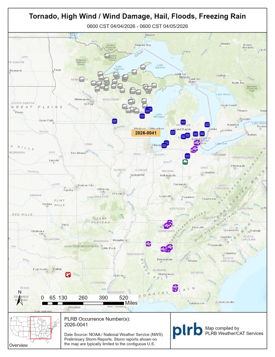 Ongoing historic river flooding in Comstock Park, Michigan, from April 4-5 storms (3-6 inches rain March 31-April 4); PLRB storm summary notes floods in MI/OH/PR/WI, plus small tornadoes PR/TX, high winds AL/MI/OH/TN. Florida Peninsula faces 3"/hr heavy rain threat today; OK/TX Panhandles critical fire weather (40 MPH gusts). NWS Northern Indiana recaps early April flooding/severe t-storms.[3][10][11]